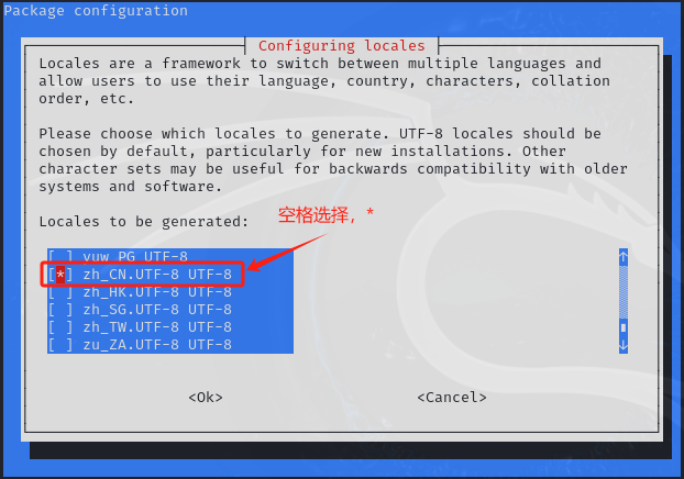 在出现的界面中,选择 zh_CN.UTF-8,通常通过空格选择。