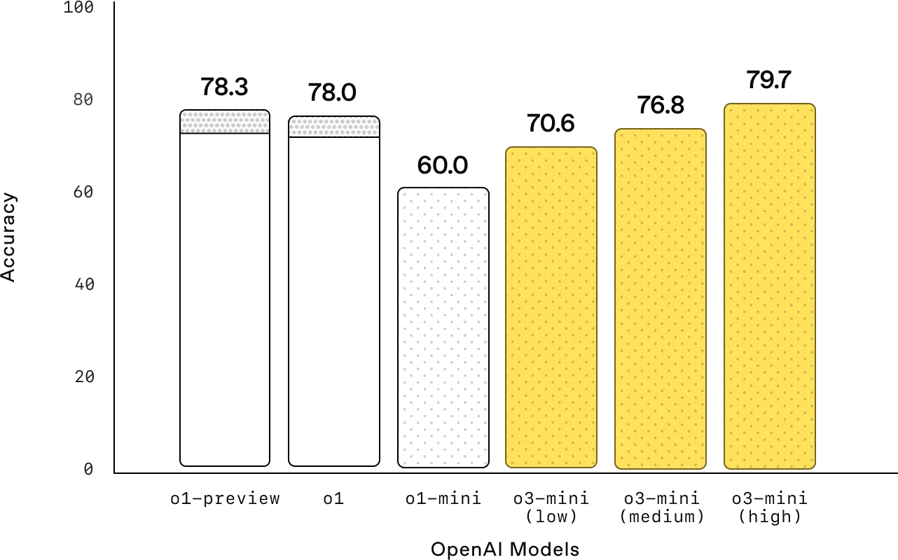 LiveBench 编码__:OpenAI o3-mini 即使在中等推理工作量下也超越了 o1-high,凸显了其在编码任务中的效率。在高推理工作量下,o3-mini 进一步扩大领先优势,在关键指标上实现了显著增强的性能。
